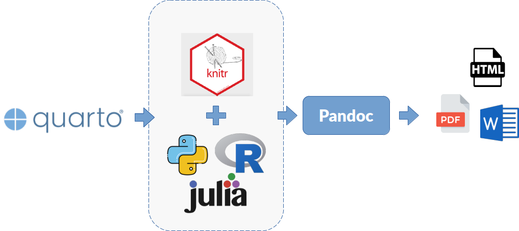 package is responsible for the connection with an interpreter of a programming language (R, Python, Julia) that can be executed in a REPL environment, in order to be able to execute software code fragments integrated into the document and generate content in Markdown format as a result. - Markdown (formatted content): a textual content markup language that allows easy formatting of the information in our documents created with Quarto.