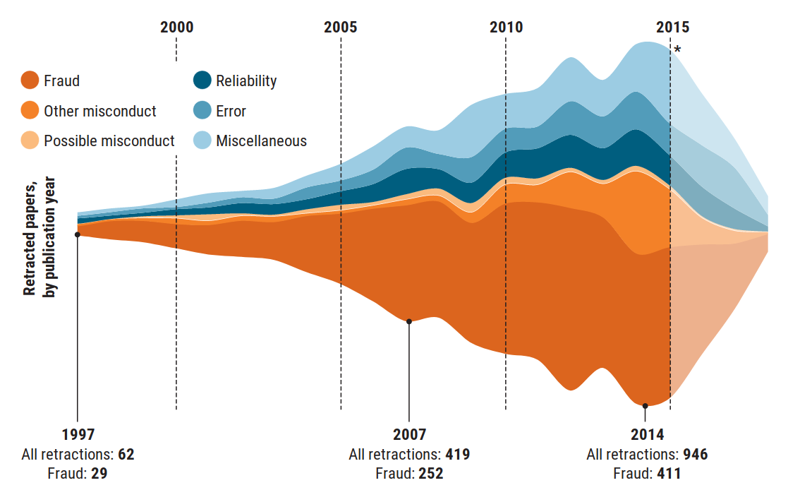 The Figure 1.3 shows a graph published in the prestigious journal Science Magazine (Brainard et al., 2018), representing the evolution of the number of research articles retracted or withdrawn for various reasons between 1997 and 2014. In this graph, we can see how the improvement of tools and the greater availability of resources allow for the analysis and review of a greater volume of publications and analyses, which allows for the detection of a more significant number of problematic cases.
