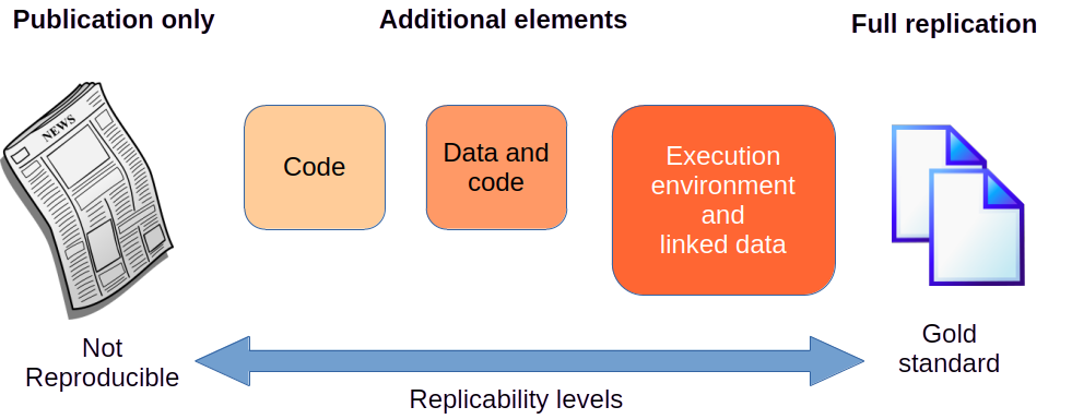 Depending on the elements published by the authors of the original study and the details provided regarding the process to carry out the study, its steps, and involved tools, we have different levels of replicability or reproducibility, represented in the Figure 1.4.