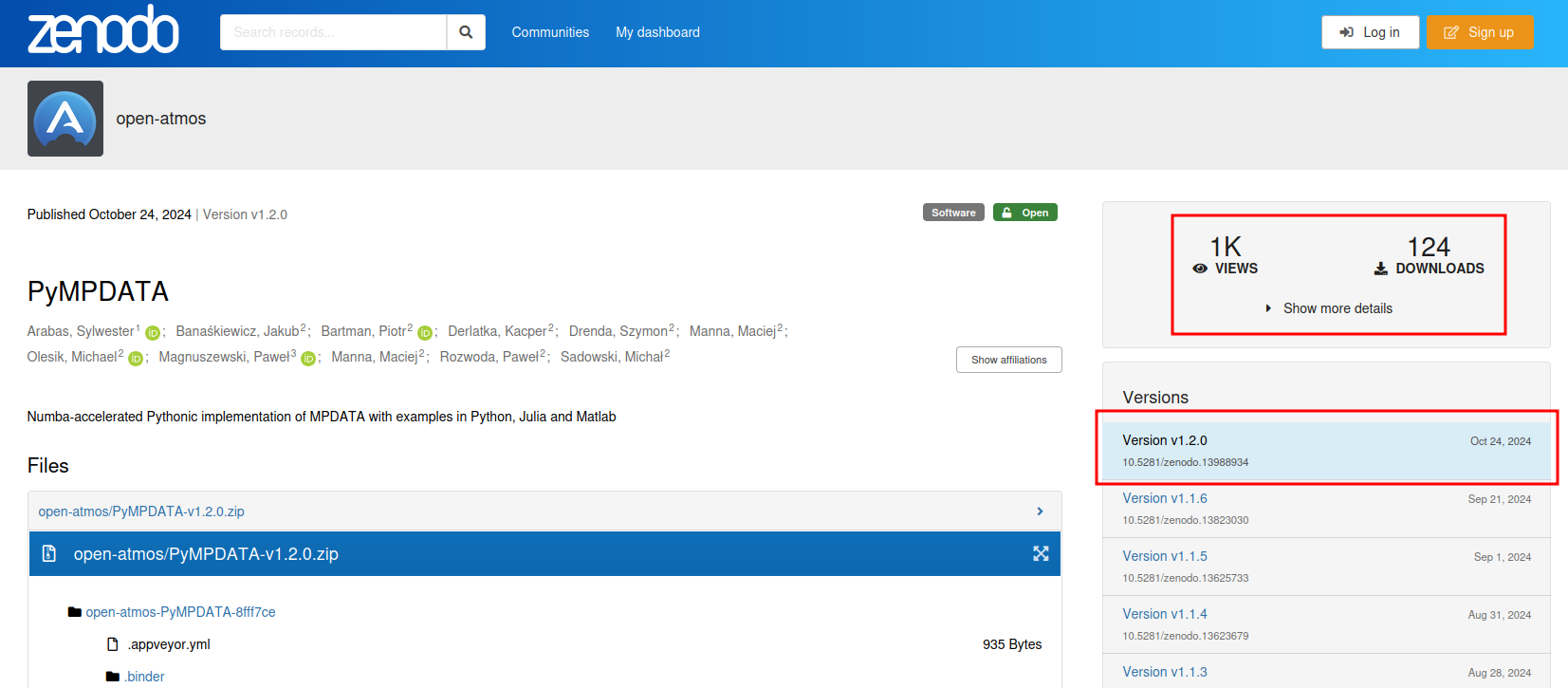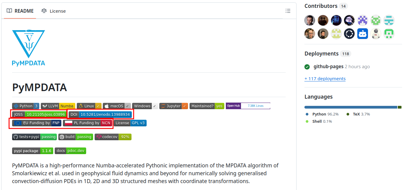 As an example, Figure 8.1 shows the Zenodo page corresponding to the PyMPDATA software, which points to the original software repository hosted on GitHub, shown in turn in the Figure 8.2. we can see metadata cross-references that maintain connection consistency in both directions.